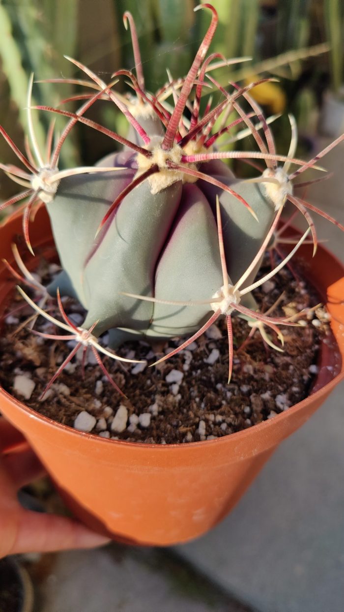 A fierce and beautiful specimen, Devil’s Tongue is known for its dramatic spines and shifting color tones. Its white, light red, and deep crimson spines curl inward like claws, while the body transitions from green-blue to deep purple along its ribbed edges—making this cactus a true desert jewel.